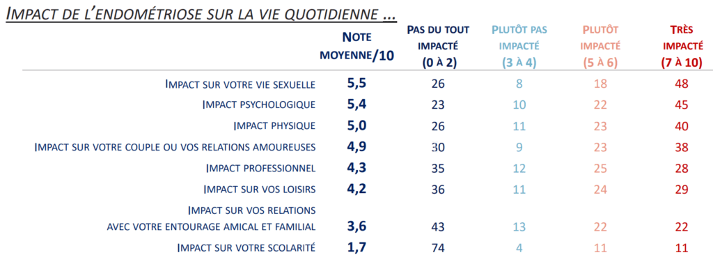 L’association EndoFrance, principale association française d’information et de défense des droits des femmes atteintes d’endométriose a réalisé en juin 2020 une enquête auprès de 1 500 patientes pour connaître l’impact de la maladie sur leur vie. Cette enquête révèle de manière non étonnante que l’endométriose impacte de nombreux aspects de la vie quotidienne des femmes atteinte de cette maladie :