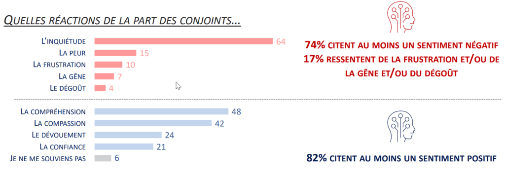 Dans l’étude réalisée par Endofrance en juin 2020, une partie a été consacrée à la réaction des conjoints face à l’annonce de la maladie. Si 82% d’entre eux évoquent spontanément au moins un sentiment positif face à l’endométriose, 74% citent un sentiment négatif et la plupart d’entre eux évoquent de l’inquiétude pour leur partenaire (64% des conjoints interrogés). Certaines parlent même de gène, de frustration ou pire, du dégoût…