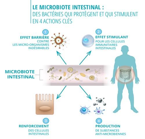 | Focus sur le lien entre microbiote et système immunitaire 70 % des cellules immunitaires du corps humain sont situées dans l’intestin. Cet organe, et plus particulièrement les bactéries qu’il contient (microbiote), joue un rôle majeur de défense contre les agents pathogènes. Préserver l’intégrité du microbiote intestinal est essentiel pour maintenir de bonnes défenses immunitaires car un microbiote en bon état joue un rôle de barrière contre les micro-organismes pathogènes et il a un effet stimulant sur les cellules immunitaires intestinales. ![]() Source : Laboratoire Lescuyer |
